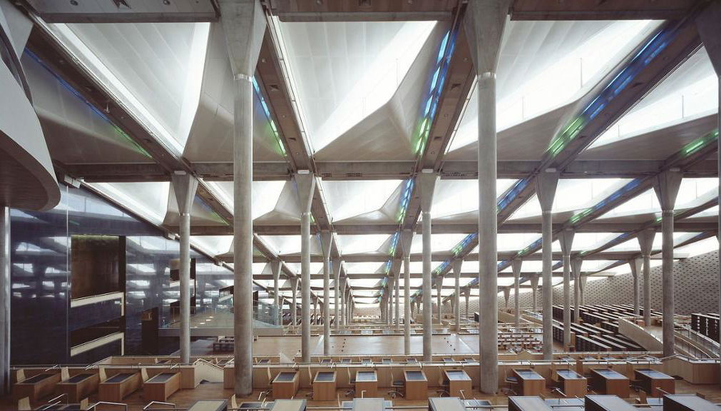 La Gran Biblioteca de Alejandría en Alejandría, Egipto, fue una de las bibliotecas más grandes e importantes del mundo antiguo. La Biblioteca formaba parte de una institución de investigación más grande llamada Mouseion, dedicada a las Musas, las nueve diosas de las artes.[10] La idea de una biblioteca universal en Alejandría puede haber sido propuesta por Demetrio de Falero, un estadista ateniense exiliado que vivía en Alejandría, a Ptolomeo I Sóter, quien puede haber establecido planes para la Biblioteca, pero la Biblioteca en sí probablemente no se construyó hasta el reinado de su hijo Ptolomeo II Filadelfo. La Biblioteca adquirió rápidamente muchos rollos de papiro, debido en gran parte a las políticas agresivas y bien financiadas de los reyes ptolemaicos para adquirir textos. Se desconoce con precisión cuántos rollos de este tipo se albergaban en un momento dado, pero las estimaciones oscilan entre 40 000 y 400 000 en su apogeo. La nueva biblioteca está construida en los terrenos donde se encontraba la antigua biblioteca.IdiomasInglés, alemán, español, francés, italiano, ruso y árabe