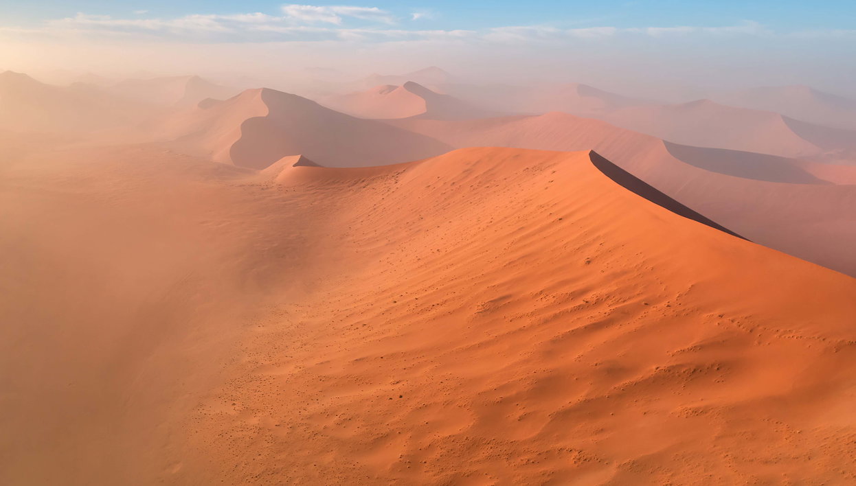 Durante aproximadamente una hora, sobrevolaréis el desierto del Namib y el salar de Sossusvlei, disfrutando de la transformación de los colores del alba que iluminan las célebres dunas rojas de Namibia y la oportunidad de observar la fauna local. ¿Podréis avistar algún antílope? ¡Estad muy atentos!