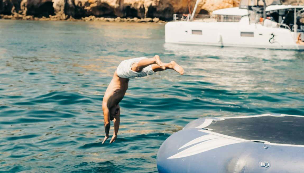 Fondearemos cerca de las formaciones rocosas de Ponta da Piedade, donde colocaremos el trampolín acuático y repartiremos gafas de snorkel. Podréis saltar al agua y durante la actividad disfrutaréis de una refrescante bebida.