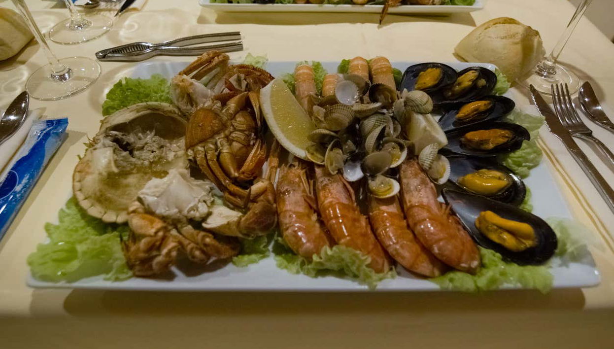 Disfrutaremos de una mariscada con empanada, buey, nécora, cigalas, langostinos, berberechos, mejillones y vino Albariño. De postre, tarta de Santiago.