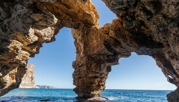 Despegando desde Valencia, llegamos a la cala de formación rocosa de La Cala del Moraig. Luego, descubre la Cueva de los Arcos, una formación rocosa natural que forma los arcos en el punto de salida al Mar Mediterráneo.